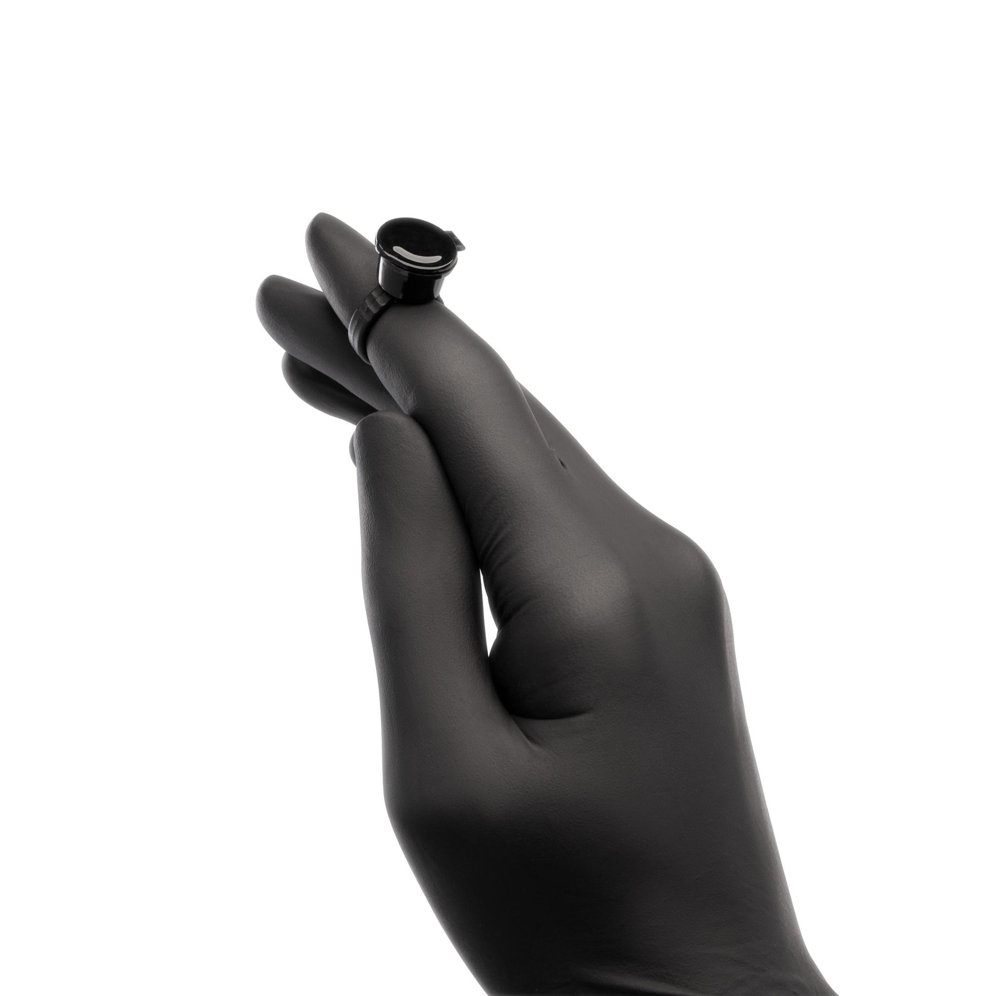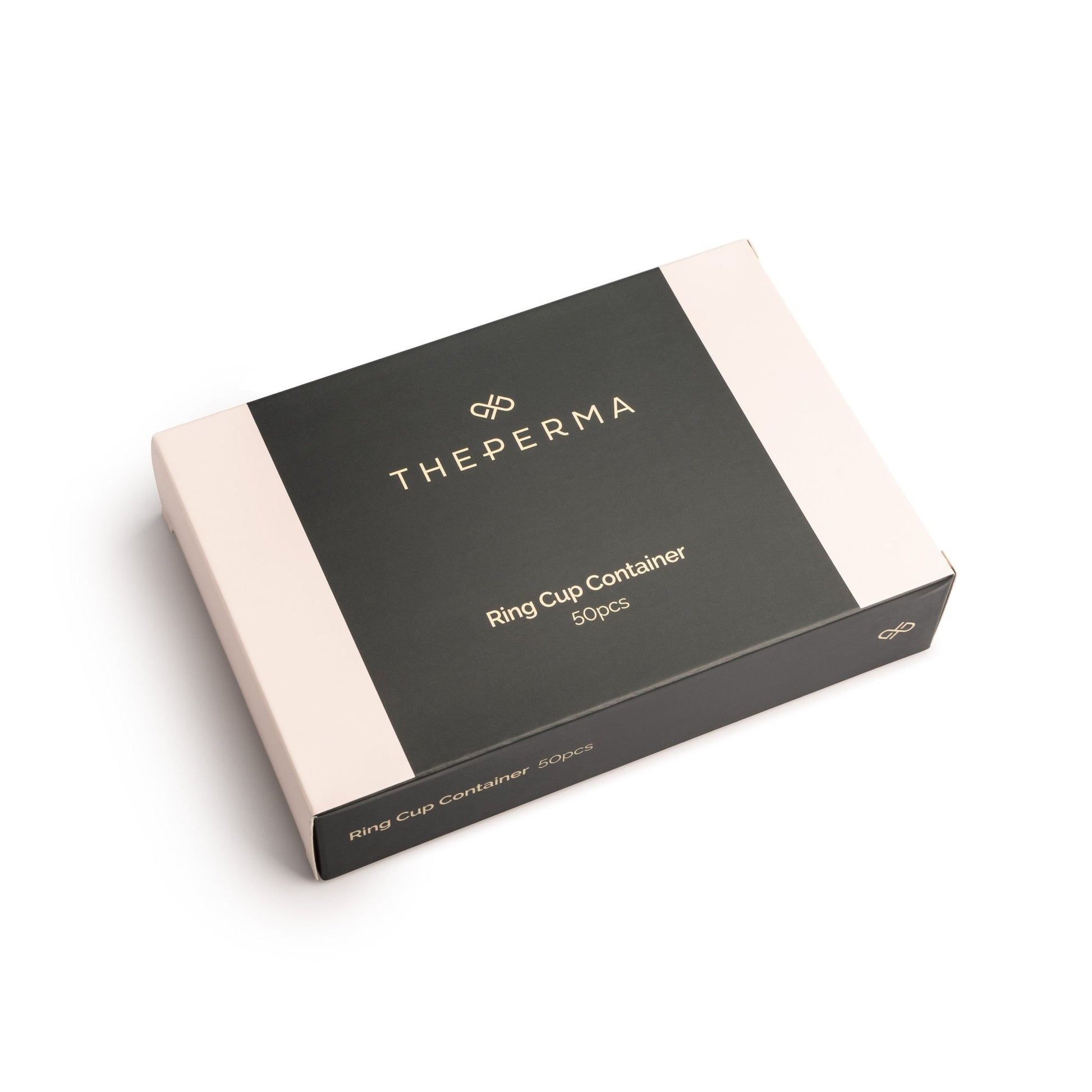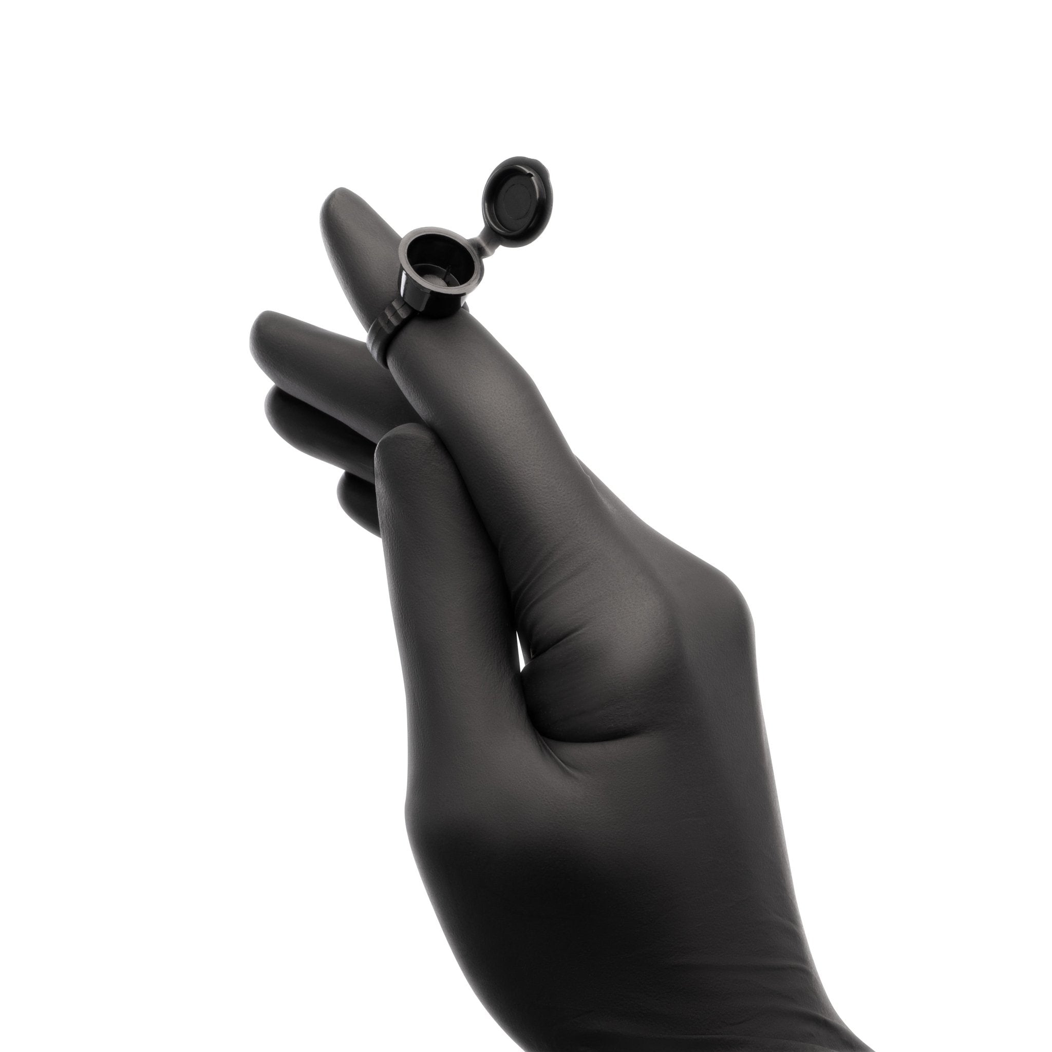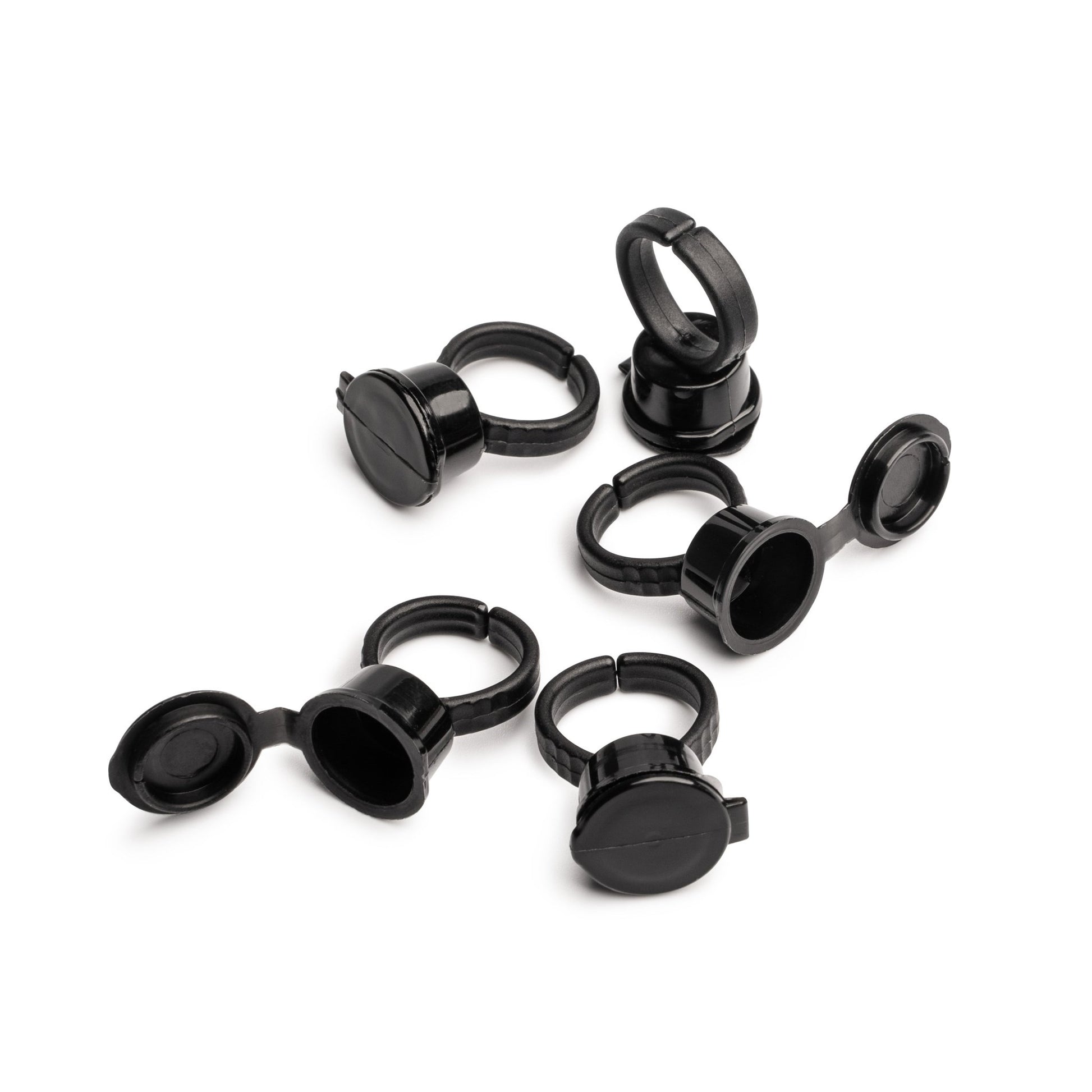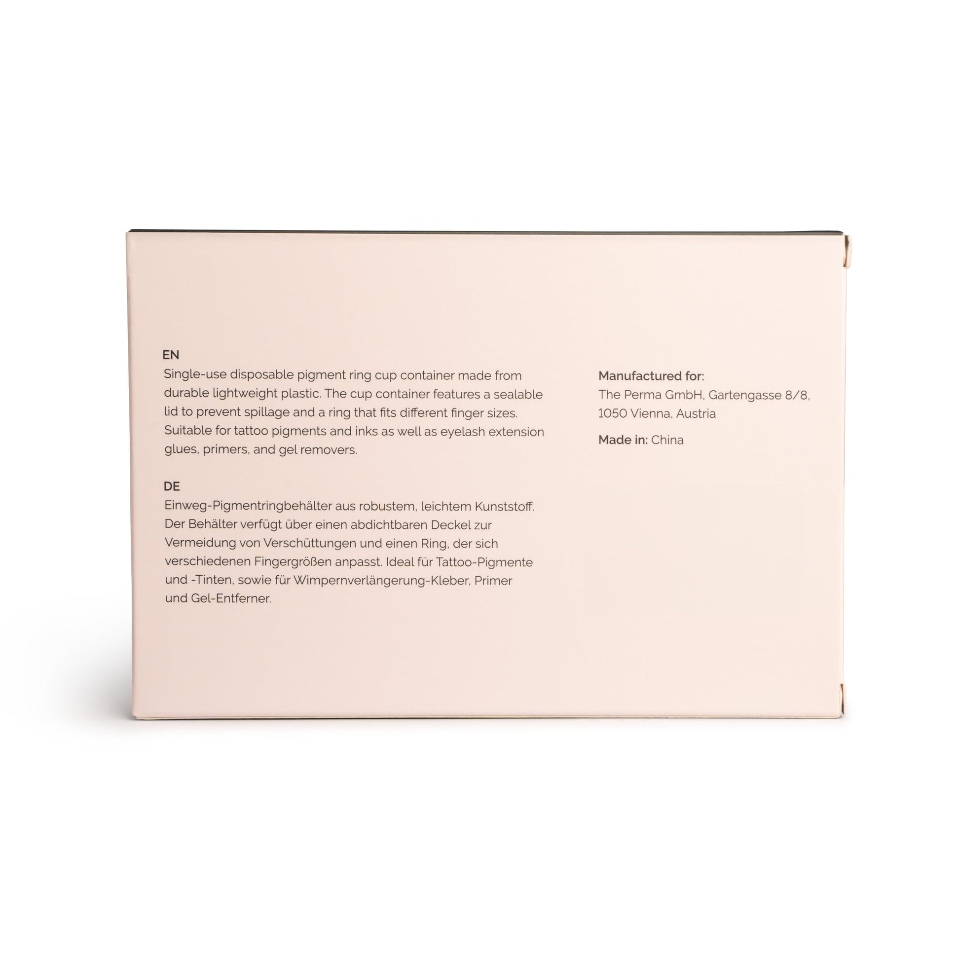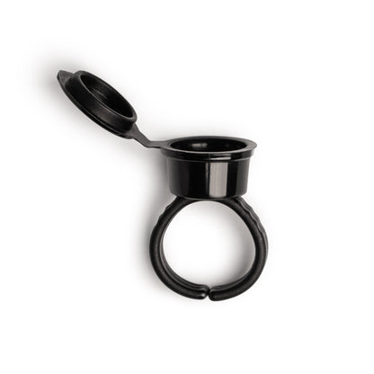 Single-use disposable pigment ring cup container made from durable lightweight plastic. The cup container features a sealable lid to prevent spillage and a ring that fits different finger sizes. Suitable for tattoo pigments and inks as well as eyelash extension glues, primers, and gel removers.